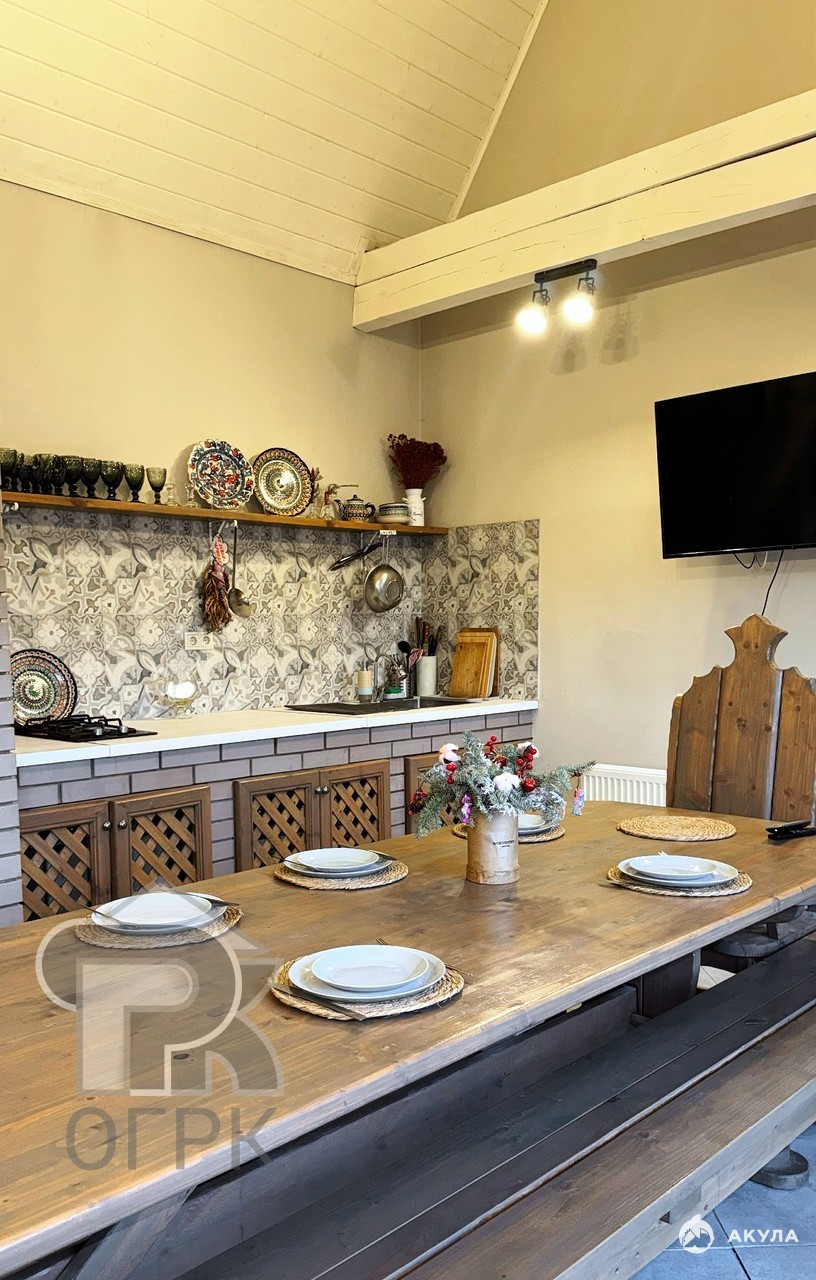 Главные козыри этого предложения — развитая инфраструктура для отдыха на собственном участке. Здесь есть все для тех, кто любит проводить время на свежем воздухе с семьей или друзьями: просторная парковка, собственная баня и специальная мангальная зона для шашлыков и посиделок в кругу близких. Дом полностью подготовлен для длительного проживания: центральное газовое отопление, все коммуникации (электричество, вода, газ, канализация, интернет) и система безопасности (на территории расположены камеры видеонаблюдения). В доме есть Wi-Fi. Разрешается проживание с детьми и не большими домашними животными.